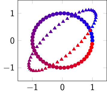$1$ つ目の図は, ベクトル $\mathbf{v}\in\mathbb{R}^2$ を矢印で表現し, 対応する $A\mathbf{v}$ もやはり矢印で表したものである. $2$ つ目の図は, 半径 $1$ の円周上にある $\mathbf{v}\in\mathbb{R}^2$ を丸で, 対応する $A\mathbf{v}$ を三角でプロットしたものである.
