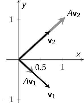 図は例に挙げた行列 $A$ の固有ベクトル $\mathbf{v}_1$, $\mathbf{v}_2$ と, $A\mathbf{v}_1$ および $A\mathbf{v}_2$ を示したものである. このように, 行列 $A$ の固有ベクトルは $A$ による変換で向きを変えないベクトルであり, 対応する固有値 $\lambda_1$, $\lambda_2$ は固有ベクトルに対する $A$ による変換の拡大率と解釈することができる.