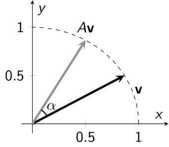 - いま, $\alpha\neq n\pi$ とする. このとき, 行列 $A$ は実数の固有値を持たない (ベクトル $\mathbf{v}$ は行列 $A$ により回転してしまうため, $\mathbf{v}$ と $A\mathbf{v}$ の向きが一致することはない).